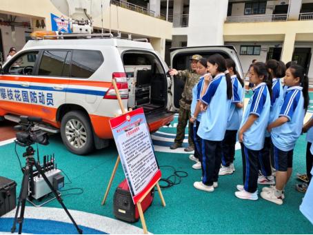 活动现场,人防小型指挥通信车、信息采集无人机、手摇警报器等设备整齐陈列,瞬间吸引了同学们的目光。国防动员工作人员化身 “讲解员”,逐一向围拢的同学们细致介绍:人防小型指挥通信车是通信系统的前沿指挥所,车是整个系统的载体,单兵摄像机相当于人的“眼睛”,采集图像通过系统这个“大脑”进行无线传输……这架无人机能在灾害现场进行勘察,把采集到的图像实时回传,为指挥所决策提供依据,还能精准投送15KG应急物资;手摇警报器在电力中断时能快速传递预警信号,是防灾减灾的“老伙计”……从设备的基本功能到在国防战备、防灾减灾中的实战应用,讲解通俗易懂又不失专业性,让同学们对这些平时难得一见的装备有了直观认知,也悄然加深了对 “国防力量”的具象理解。?