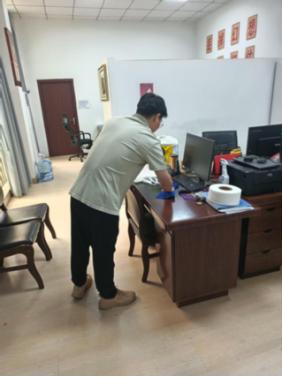 当日上午,全办职工首先对办公区域进行全面清洁。大家分工协作,对办公室、会议室、走廊等场所进行彻底打扫,规范物品摆放,清理积尘和蛛网,检查水培植物并及时更换清水,确保办公环境整洁美观、无卫生死角。与此同时,按照病媒生物防制工作要求,对办公区域垃圾桶进行清洗消杀,防止蚊蝇孳生。